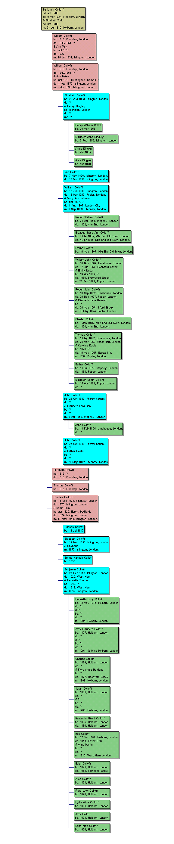 This part of the tree only shows one of the London branches for four generations from Benjamin who is the earliest we know of that branch. The whole branch now contains over two hundred entries to present day. Hopefully, one day we will find a common link between the branches.